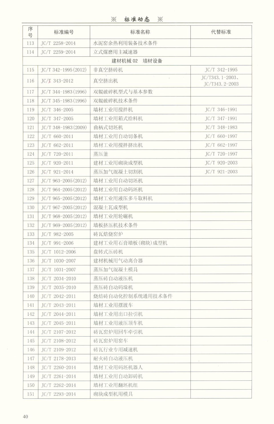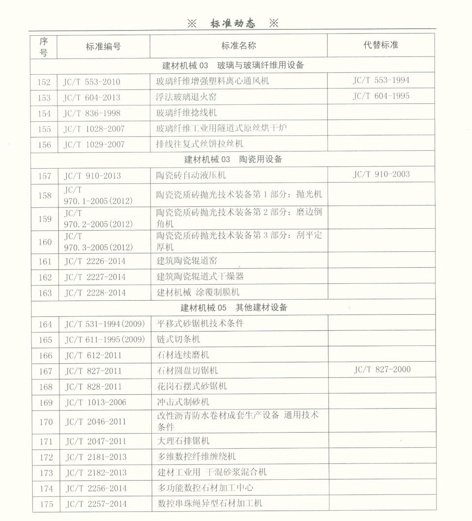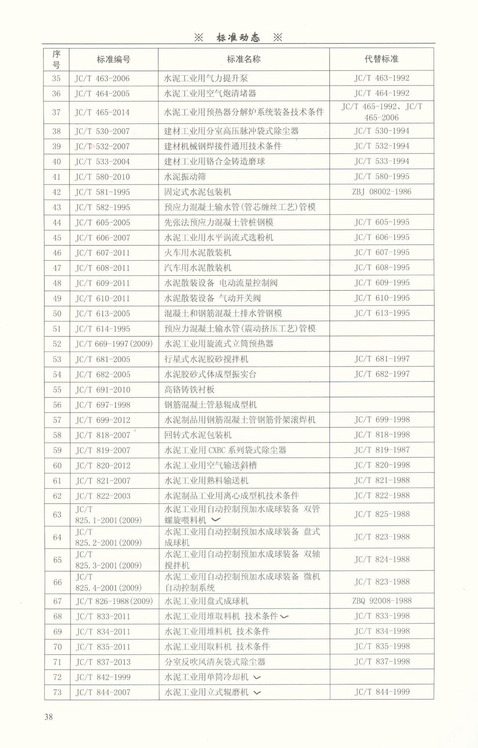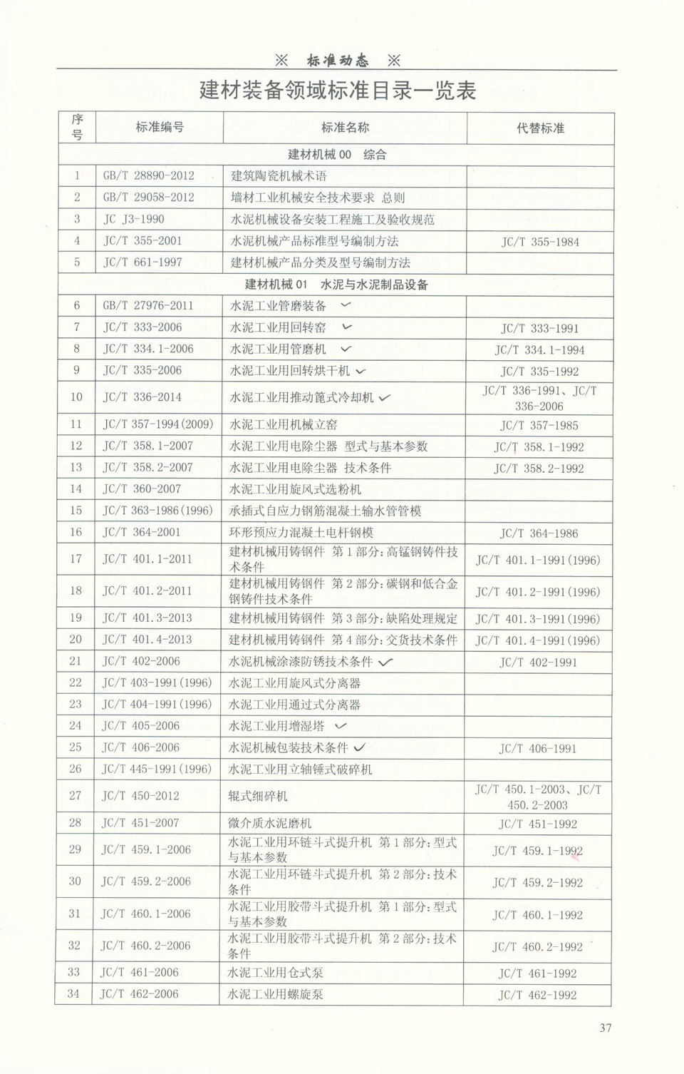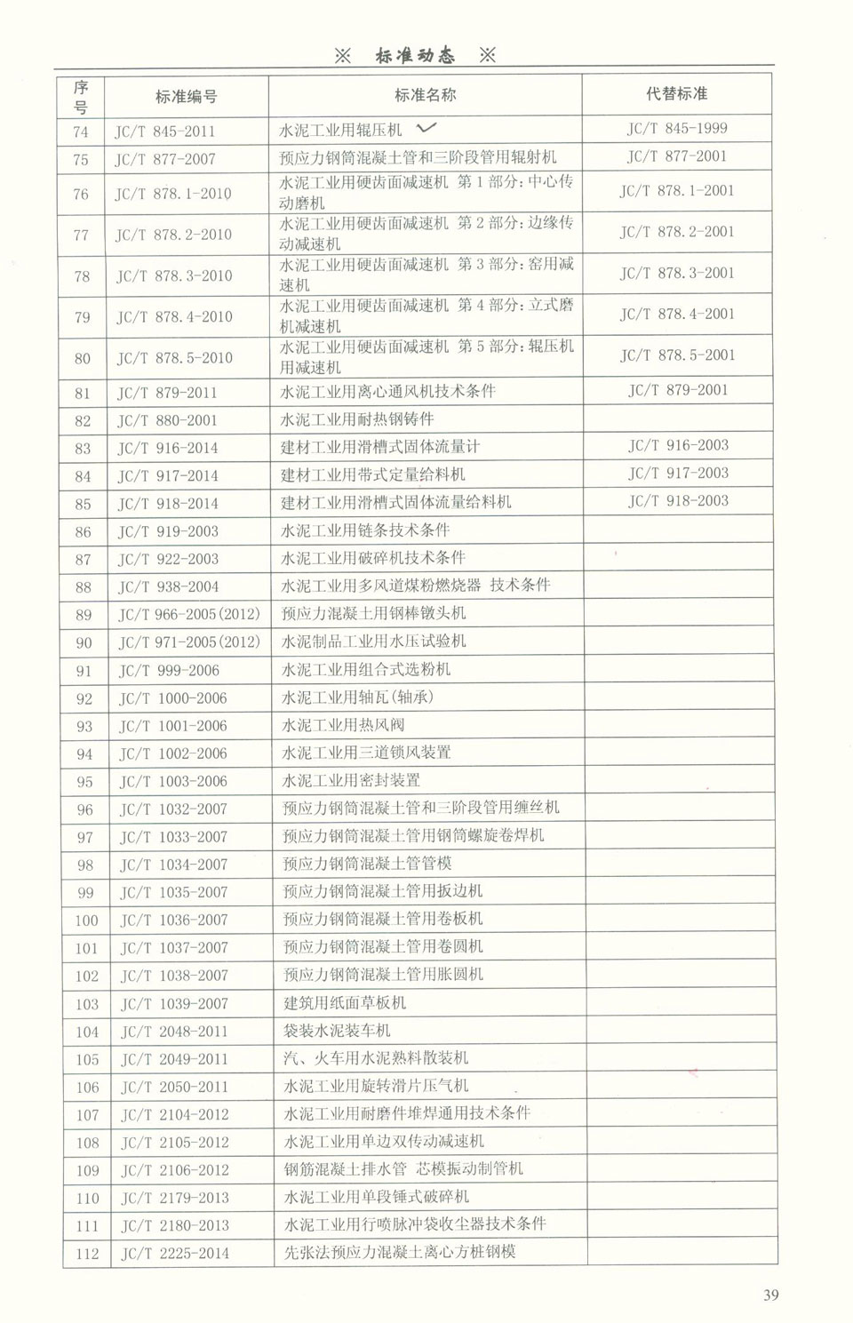 江蘇鵬飛集團著眼于國內建材機械新技術、新產品、新工藝、新材料的技術領域,普及和提高標準化意識,強化新標準的宣貫工作,提高對標準化工作的感知、重視程度,全面提高行業(yè)各類標準的覆蓋率,創(chuàng)造更加良好的標準化工作發(fā)展空間。公司在企業(yè)內部制定并實施了技術標準、管理標準和工作標準并有效組織推進實施,先后參與國家建材機械標準化技術委員會組織的GB/T27976-2011水泥工業(yè)管磨裝備、JC/T 333-2006 水泥工業(yè)用回轉窯、JC/T 334.1-2006水泥工業(yè)用管磨機、JC/T335-2006 水泥工業(yè)用回轉烘干機、JC/T 336-2014 水泥工業(yè)用推動篦式冷卻機、JC/T 402-2006 水泥機械涂漆防銹技術條件、JC/T 825.1-2001(2009) 水泥工業(yè)用自動控制預加水成球裝備 雙管螺旋喂料機、 JC/T 833-2011 水泥工業(yè)用堆取料機 技術條件 JC/T 842-1999 水泥工業(yè)用單筒冷卻機、JC/T 844-2007 水泥工業(yè)用立式輥磨機、JC/T845-2011水泥工業(yè)用輥壓機、JC/T401-2011建材機械用鑄鋼件技術條件、JC/T999-2006水泥工業(yè)用組合式選粉機、JC/T406-2006水泥機械包裝技術條件、JC/T405-2006水泥工業(yè)用增濕塔等15項產品標準起草工作.