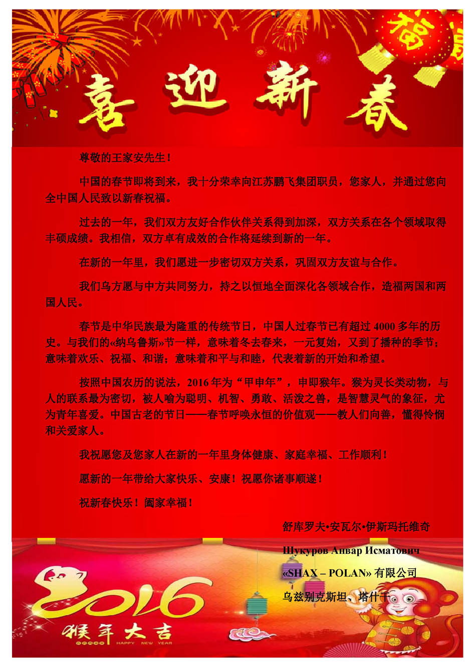 烏茲別克斯坦《SHAX-POLAN》有限公司給我公司發(fā)來(lái)新春賀電