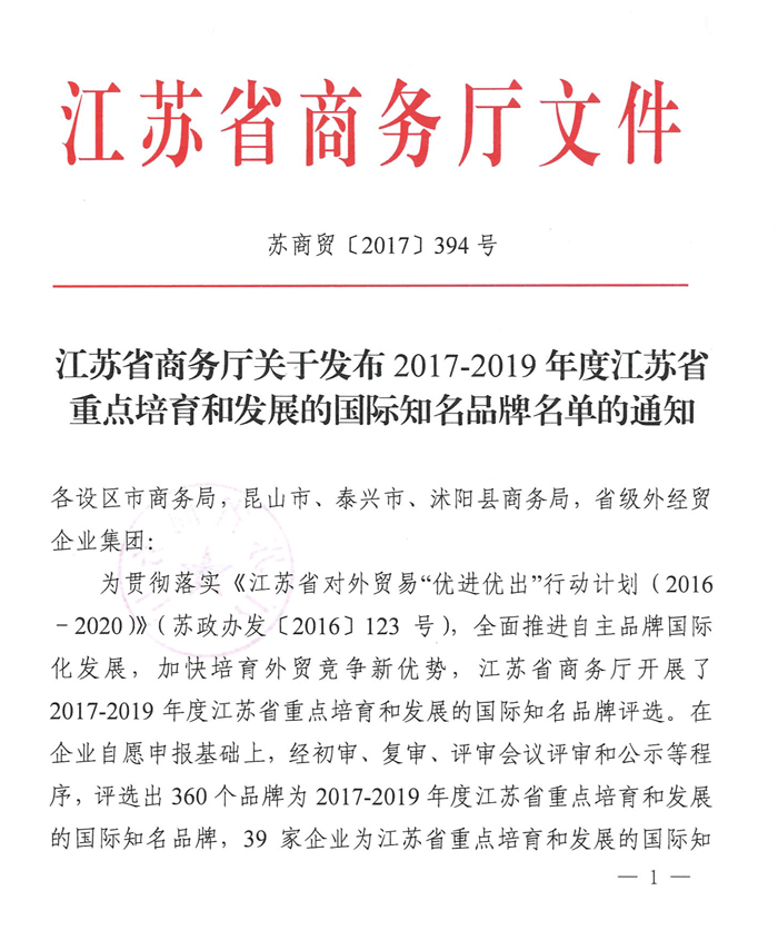 近日,省商務(wù)廳公布“2017-2019年度江蘇省重點(diǎn)培育和發(fā)展的國際知名品牌”名單,經(jīng)過層層評(píng)比,江蘇鵬飛集團(tuán)榮膺在列。