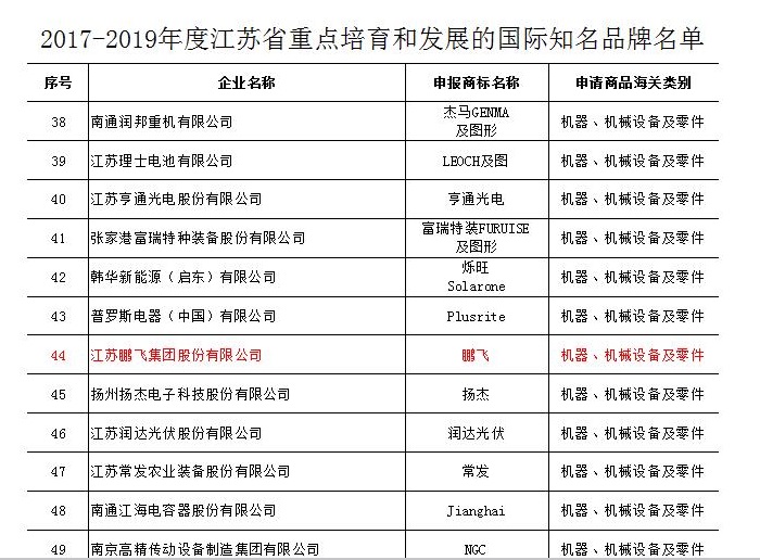 “鵬飛”入選江蘇省重點(diǎn)培育國際知名品牌名單