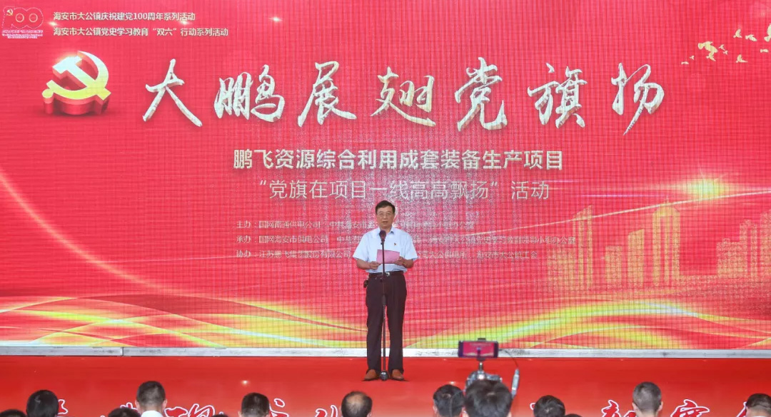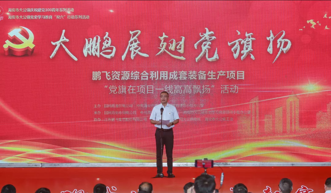 “今天活動(dòng)現(xiàn)場(chǎng)的‘鵬飛資源綜合利用成套裝備生產(chǎn)項(xiàng)目’是2021年江蘇省重大項(xiàng)目,南通市‘黨旗在項(xiàng)目一線高高飄揚(yáng)’活動(dòng)第一批啟動(dòng)項(xiàng)目。為了著力提升服務(wù)效能,健全重大項(xiàng)目服務(wù)機(jī)制,大公鎮(zhèn)牽頭組織成立項(xiàng)目臨時(shí)黨支部、項(xiàng)目服務(wù)專班,一刻不停推項(xiàng)目,讓黨旗飄揚(yáng)在項(xiàng)目一線;一著不讓抓發(fā)展,讓黨員沖鋒在項(xiàng)目一線;一以貫之優(yōu)環(huán)境,讓服務(wù)下沉到項(xiàng)目一線,著力辦實(shí)事、解難題,為推進(jìn)重大項(xiàng)目建設(shè)提供有力支撐和堅(jiān)實(shí)保障。”大公鎮(zhèn)黨委書記金山存說。