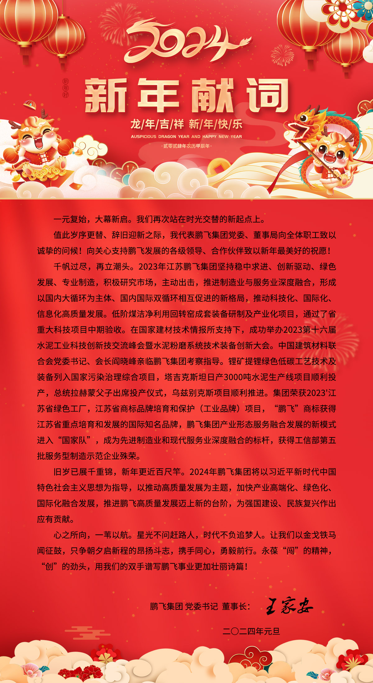 龍年吉祥 新年快樂 江蘇鵬飛集團(tuán)董事長(zhǎng)王家安元旦獻(xiàn)詞