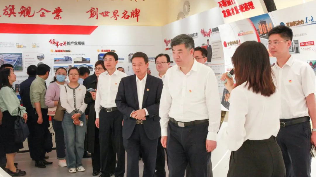 南通市委書記吳新明、海安市委書記譚真參觀鵬飛展示中心,董事長王家安向其介紹產(chǎn)品研發(fā)、生產(chǎn)銷售、國外市場拓展情況