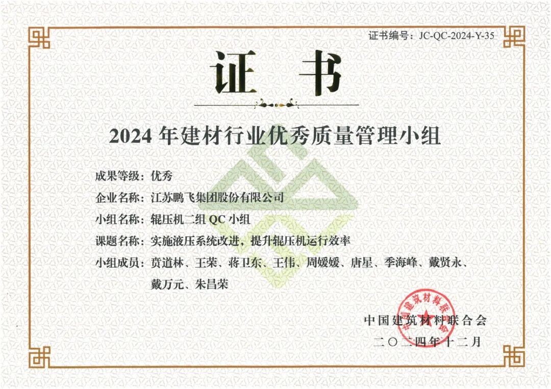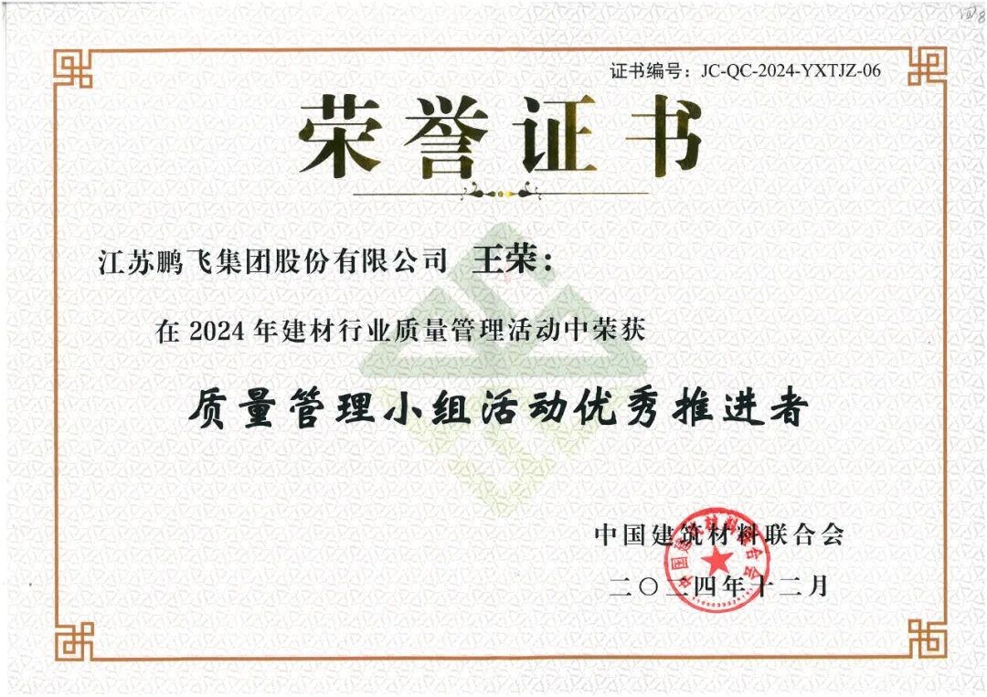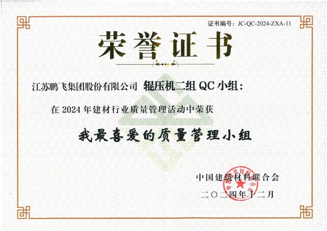 會議為2024年建材行業(yè)質(zhì)量管理活動優(yōu)秀質(zhì)量管理成果、先進(jìn)個(gè)人和優(yōu)秀組織,2024年建材行業(yè)質(zhì)量管理活動“我最喜愛的質(zhì)量管理小組”和“我最喜愛的質(zhì)量信得過班組”,以及2024年度建材行業(yè)“三品”典型案例的獲得者頒發(fā)證書。鵬飛多項(xiàng)成果榮獲佳績。