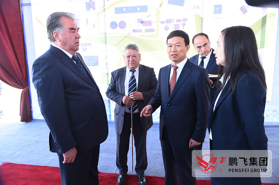 董事長(zhǎng)王家安陪同塔吉克斯坦總統(tǒng)埃莫馬利·拉赫蒙出席由鵬飛總承包該國(guó)日產(chǎn)3300噸水泥生產(chǎn)線EP項(xiàng)目奠基儀式