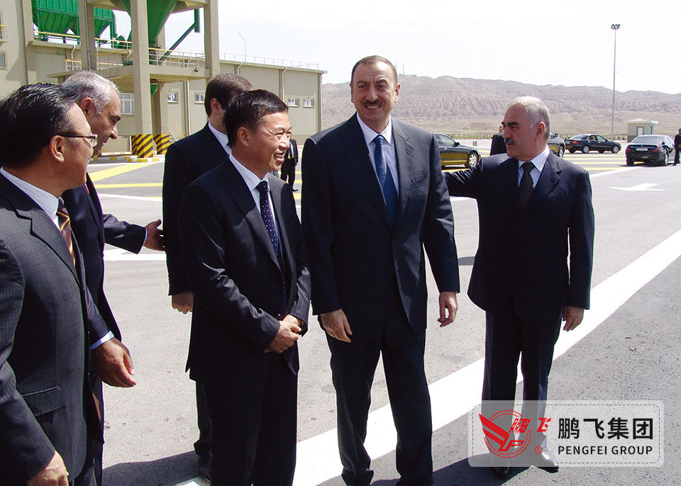 總裁王家安與阿塞拜疆總統(tǒng)伊利哈姆·阿利耶夫共同出席鵬飛集團(tuán)承建的阿塞拜疆納希切萬(wàn)水泥廠周年慶典