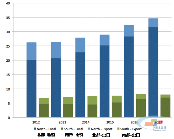 上圖展現(xiàn)了巴基斯坦國內水泥行業(yè)的現(xiàn)狀,巴基斯坦的年度水泥消費量從2012年的3310萬噸增長到了2017年的4280萬噸,增長幅度在30%左右,其中五分之四的水泥消費集中在巴基斯坦的北部地區(qū)。與此同時,更重要的是,巴基斯坦的出口水泥從2013年的830萬噸降低到了2017年的420萬噸。造成這一現(xiàn)象的主要原因是阿富汗市場的下跌,以及水性熟料出口量的減少??紤]到南方市場的出口水泥比例較高,盡管水泥總消費量在增長,但是出口量的減少對南方可能會造成更大的打擊。2018年到目前為止,類似的趨勢依然存在,唯一有所改變的是南方熟料出口量的在今年有反彈的跡象。
