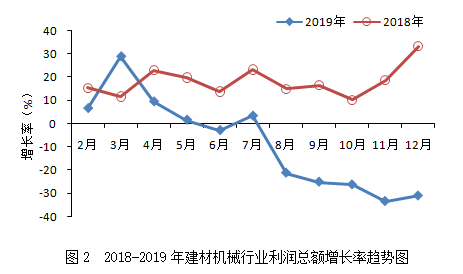 2019年,建材機(jī)械行業(yè)累計(jì)實(shí)現(xiàn)利潤(rùn)總額36.57億元,同比下降31.00%,增速較上年同期回落64.26個(gè)百分點(diǎn),落后于建材工業(yè)(15.6%)、機(jī)械工業(yè)(-4.53%)的增速,遠(yuǎn)低于建材機(jī)械相關(guān)領(lǐng)域工程機(jī)械(16.48%)、重型礦山機(jī)械(21.65%)增速。從增速變化趨勢(shì)看(見圖2),全年利潤(rùn)總額增速下行態(tài)勢(shì)明顯,且與上年相比回落較大,降幅最高達(dá)64.26個(gè)百分點(diǎn)。