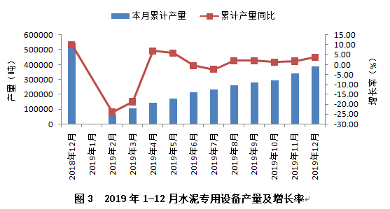 從行業(yè)重點(diǎn)監(jiān)測(cè)的產(chǎn)品看,水泥專用設(shè)備產(chǎn)量實(shí)現(xiàn)小幅增長(zhǎng),2019年累計(jì)完成38.65萬噸,同比增長(zhǎng)3.69%,較上年同期下降6.37個(gè)百分點(diǎn)。從全年產(chǎn)量增速變化趨勢(shì)看(見圖3),上半年波動(dòng)較大,下半年逐步趨緩、趨穩(wěn)。