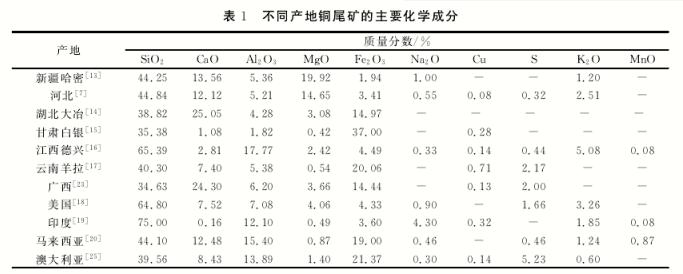銅尾礦的化學組成非常復(fù)雜,不同產(chǎn)地的銅尾礦之間可比較性差,這是銅礦石成礦地質(zhì)、礦石開采方法、選礦工藝以及銅尾礦堆存方式等差異所致。組成銅尾礦的主要元素有 Mg、Al、Si、S、Ca、Fe、Cu 等,且 伴 有 Mn、Ti、Zn、Sr等 微 量 元素。不同產(chǎn)地銅尾礦的主要化學成分見表1。