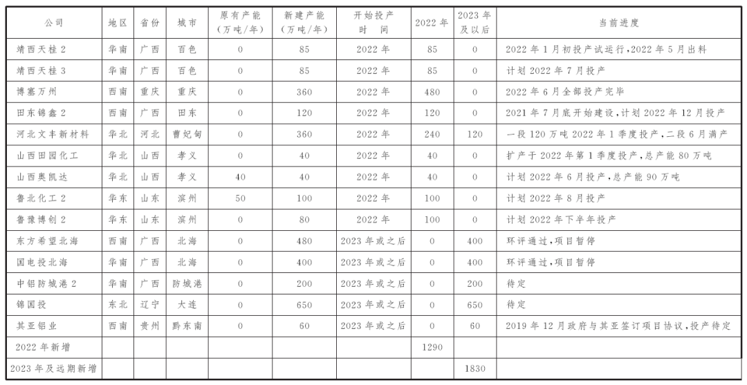 表3 2017~2023年及遠(yuǎn)期國內(nèi)氧化鋁新建產(chǎn)能列表