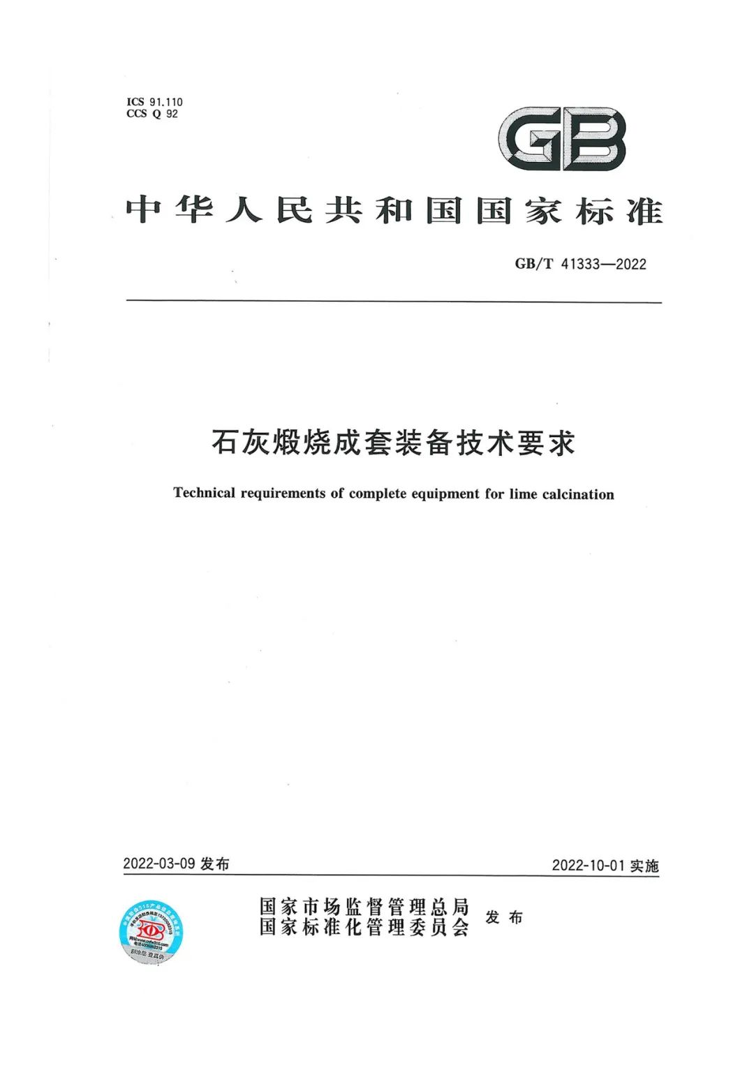 石灰行業(yè)《石灰煅燒成套裝備技術(shù)要求》(GB/T 41333-2022)最新標準于2022年3月9日正式發(fā)布,并將于2022年10月1日起實施。