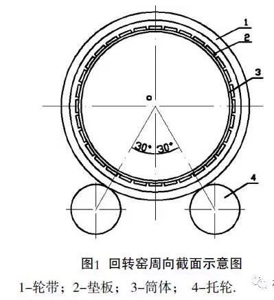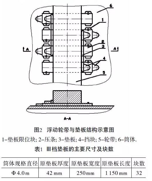 我公司生產(chǎn)的回轉(zhuǎn)窯采用浮動輪帶支撐窯筒體,輪帶是實心矩形斷面活套套在筒體上,加固窯筒體,見圖1。輪帶與筒體之間均勻分布著32塊墊板,避免輪帶內(nèi)表面與筒體外表面直接接觸。圖2為浮動輪帶與墊板結(jié)構(gòu)示意圖。表1為Ⅲ檔原墊板 的主要尺寸及塊數(shù)。在回轉(zhuǎn)窯運轉(zhuǎn)過程中,筒體、輪帶和墊板之間留有一定的間隙。表2為輪帶內(nèi)徑與墊板外徑之間的間隙,這樣必然引起輪帶與筒體墊板之間產(chǎn)生滾動和滑移。我公司生產(chǎn)的回轉(zhuǎn)窯已運轉(zhuǎn)僅年,墊板與輪帶內(nèi)圈均有不同程度的磨損,使輪帶起不到加固筒體作用,造成筒體橫截面變形增大,同時輪帶和墊板之間產(chǎn)生很大滑移,已超過極限值,致使限制輪帶軸向竄動的壓條頻繁被推掉。