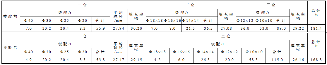 經(jīng)多次考察并做篩余曲線和顆粒級配分析后決定,將磨機(jī)二、三倉合并,原一倉倉長3.7m,二倉倉長2.7m,三倉倉長6.1m,改造后一倉倉長3.7m,二倉倉長8.8m,同時調(diào)整研磨體平均球徑及填充率,技改前后研磨體級配對比見表2。