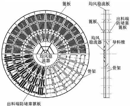 該隔倉板是在進(jìn)料端篦板與隔倉板骨架間設(shè)置均風(fēng)穩(wěn)流板和均風(fēng)穩(wěn)流器,這樣在磨機(jī)中通過隔倉板的物料量大量增加的情況下,前后隔倉板的物料流速達(dá)到均衡,利于保持合理的球料比。在骨架中導(dǎo)料錐的作用下,物料沿導(dǎo)料錐隨磨機(jī)的旋轉(zhuǎn)以遠(yuǎn)低于風(fēng)速的速度流入后倉,消除隔倉板附近的“低效研磨區(qū)”。