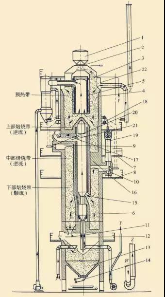 1.料斗;2.料口;3.加料斗;4.外筒;5.上內(nèi)筒;6.下內(nèi)筒;7.上燒嘴平臺;8.下燒嘴平臺;9.上燃燒室;10.下燃燒室;11.液壓推桿系統(tǒng);12.出料臺;13.石灰倉;14.振動出料機(jī);15.循環(huán)氣體入口;16.拱橋;17.冷卻梁;18.環(huán)形管道;19.噴射器;20.燒嘴;21.循環(huán)氣體管道;22.環(huán)形煙道。