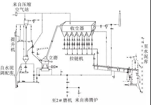生產(chǎn)P·O42.5水泥時工藝流程是:熟料、石膏、石灰石、粉煤灰、礦渣等物料經(jīng)輸送設(shè)備輸送至各配料倉,粉煤灰從粉煤灰?guī)煜陆?jīng)輸送設(shè)備進入生產(chǎn)系統(tǒng)。各種物料按一定比例設(shè)定,分別經(jīng)各定量給料機和輸送設(shè)備送至入磨鎖風閥后入磨。入磨物料在磨內(nèi)進行烘干和粉磨,粉磨后的物料經(jīng)選粉機分離,粗粉返回磨盤重新粉磨,合格細粉隨氣流直接進入袋式收塵器進行收集,收集下來的成品經(jīng)空氣斜槽、斗式提升機等輸送設(shè)備入水泥庫儲存;立磨吐渣經(jīng)輸送設(shè)備(設(shè)有除鐵器)進入循環(huán)斗式提升機,提升入磨后繼續(xù)粉磨。沸騰爐提供的熱風與循環(huán)風、冷風混合后進入磨內(nèi),磨內(nèi)混合風起到烘干和提升物料的作用,出磨氣流進入布袋收塵器;出布袋收塵器的氣體經(jīng)循環(huán)風機后一部分經(jīng)循環(huán)風管,作為循環(huán)風入磨,其余氣體經(jīng)煙囪排入大氣。系統(tǒng)工藝流程見圖1。