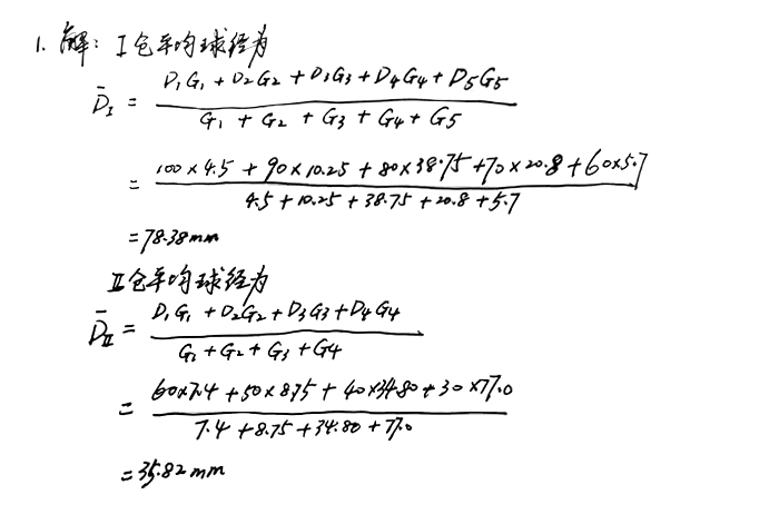 1、φ4.2*12m磨機鋼球級配方案是Ⅰ倉:φ100mm的4.5t,φ90mm的10.25t,直徑80mm的38.75t,φ70mm的20.80t,φ60mm的5.70t;Ⅱ倉:φ60mm的7.40t,φ50mm的8.75t,φ40mm的34.80t,φ30mm的77.0t,求Ⅰ、Ⅱ倉的平均球徑。