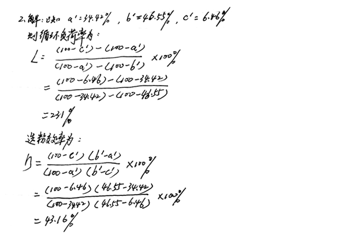 2、磨機正常運轉(zhuǎn)后,分別在出磨斜槽、粗粉斜槽及細粉斜槽各取5個樣,其0.08mm篩孔平均篩余分別是34.42%,46.55%,6.46%,求其循環(huán)負荷率和選粉效率。