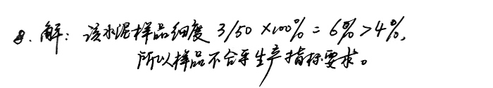 8、某廠水泥樣品50g,經(jīng)0.08mm方孔篩篩析,達到規(guī)定時間所剩料量為3g,問該樣品是否合乎生產(chǎn)指標要求?(要求水泥細度<4%)