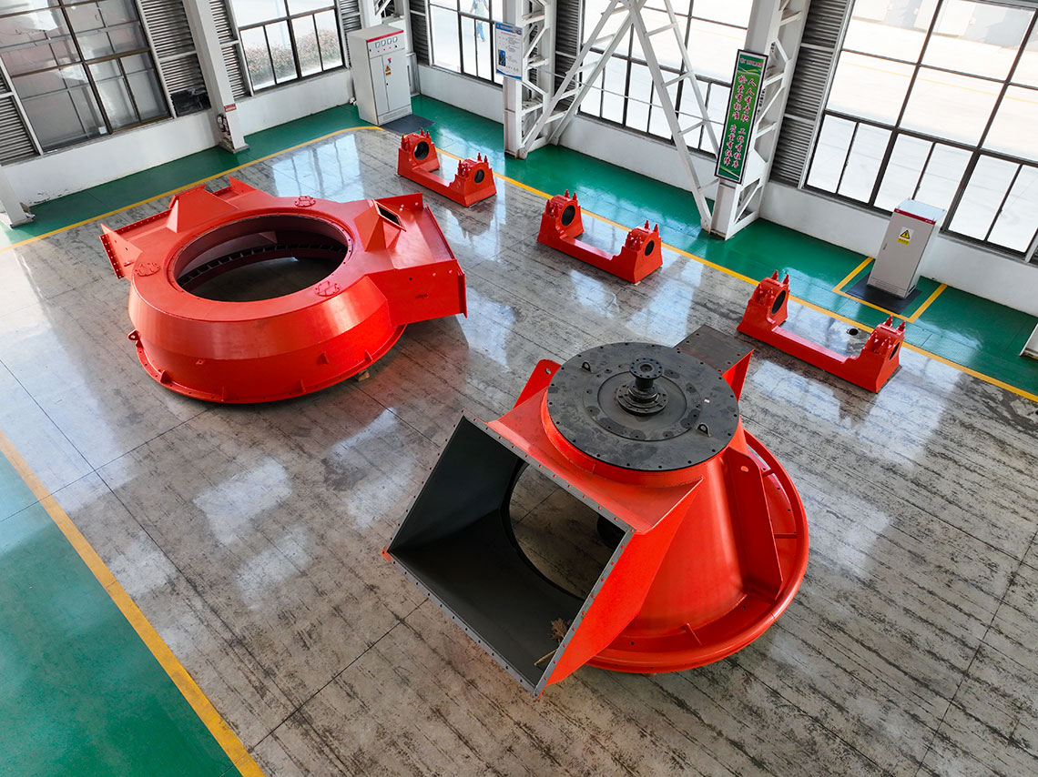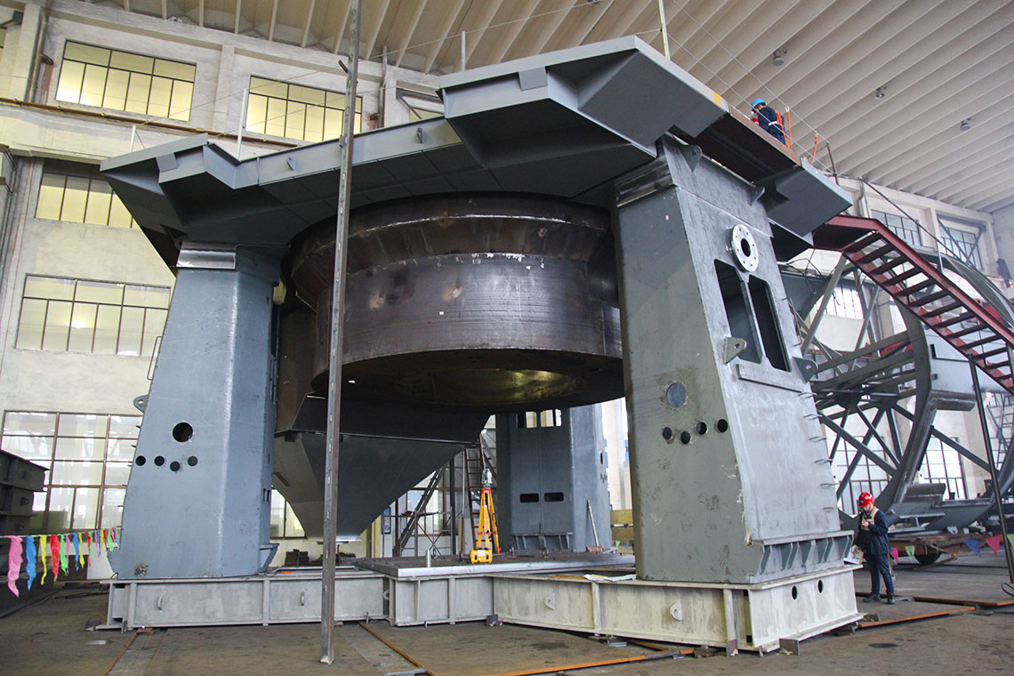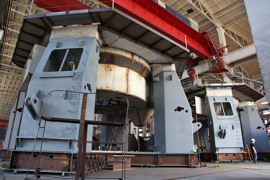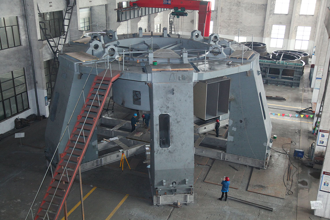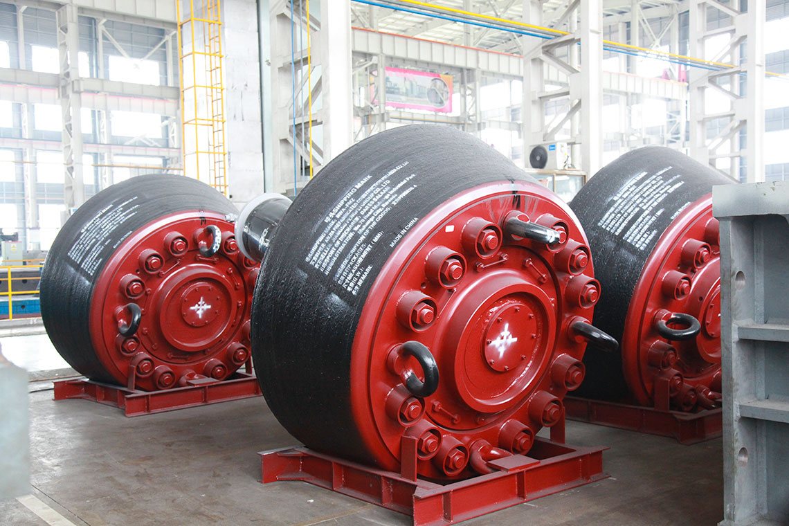 磨煤機(jī)三個(gè)磨輥由旋轉(zhuǎn)的磨盤帶動(dòng)進(jìn)行碾磨作業(yè)。入磨物料經(jīng)中心落煤管落在磨盤上后,由旋轉(zhuǎn)磨盤產(chǎn)生的離心力將其輸送至碾磨輥道上碾磨。碾磨壓力由彈簧或液壓加壓裝置產(chǎn)生,通過靜定的三點(diǎn)系統(tǒng),碾磨力均勻地傳至三個(gè)磨輥,通過加壓系統(tǒng)壓力傳至基礎(chǔ)。煤粉的干燥和輸送利用熱風(fēng)來進(jìn)行。熱風(fēng)通過噴嘴環(huán)均勻分布于磨盤四周,將經(jīng)碾磨的物料干燥并輸送至磨機(jī)上部的分離器。物料的粗細(xì)粉在此分離,細(xì)粉排出磨機(jī),粗粉重新返回磨內(nèi)碾磨。物料中的一些不可破碎物可通過磨機(jī)下部的排碴口排出。磨煤機(jī)主要由基礎(chǔ)部,減速機(jī),下架機(jī),中架機(jī),磨盤,磨輥,加壓裝置,分離器,正壓風(fēng)密封裝置,蒸汽吹掃裝置等部件組成,還配有主電動(dòng)機(jī),潤滑油站,液壓站和密封風(fēng)機(jī)等附屬設(shè)備,另備有慢速傳動(dòng)裝置,安裝檢修專用工具,扶梯平臺(tái),煤粉分配器,速斷閥等配套設(shè)備供用戶選用。磨煤機(jī)采用液壓加壓系統(tǒng),在運(yùn)行中即可對(duì)粉磨壓力進(jìn)行調(diào)整,并具有更好的過鐵保護(hù)性能。在原標(biāo)準(zhǔn)型的基礎(chǔ)上增加了磨輥翻出裝置,并提高了磨體的抗爆能力。